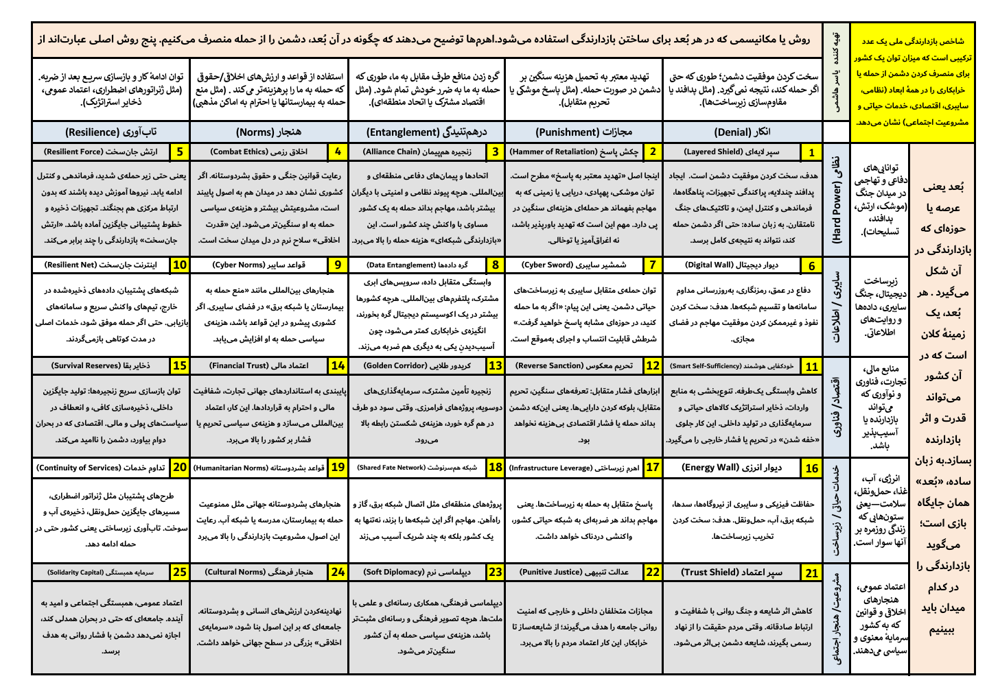 در این مقاله، بازدارندگی را نه به عنوان یک ابزار صرفاً نظامی، بلکه به عنوان یک «ماتریس یکپارچه» بررسی میکنیم. در این ماتریس، پنج بُعد حیاتی ( نظامی ، سایبری/اطلاعاتی ، اقتصادی/فناورانه ، خدمات حیاتی ، و مشروعیت/هنجارها ) در کنار پنج روش اصلی ( انکار ، مجازات ، درهمتنیدگی ، هنجار و تابآوری ) قرار میگیرند. حاصل این ترکیب، تصویری چندبعدی است که نشان میدهد بازدارندگی فقط هنر تهدید نیست ، بلکه هنر قانعکردن، مقاومتکردن و ادامه دادن زندگی در سختترین روزهاست.