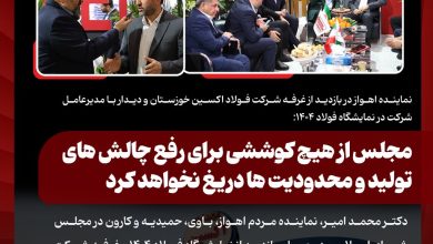 نماینده اهواز در بازدید از غرفه شرکت فولاد اکسین خوزستان و دیدار با مدیرعامل شرکت در نمایشگاه فولاد ۱۴۰۴: مجلس از هیچ کوششی برای رفع چالش های تولید و محدودیت ها دریغ نخواهد کرد